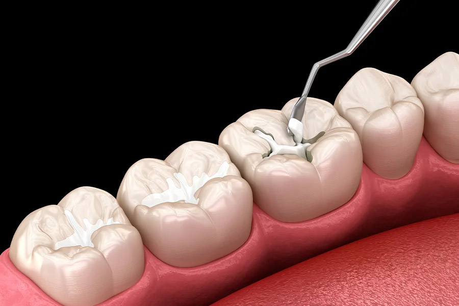 歯には複雑で細かい溝があり、特に奥歯は歯磨きをしても汚れを完全に取り除くのが困難です。そこで溝の中に虫歯菌が入り込まないように、溝の部分をシーラント(特殊プラスチック)で塞いで虫歯予防をします。
